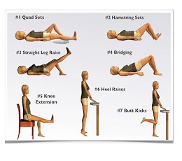 The back of your knee should stay in contact with the blanket or towel during the exercise. Straight leg raises. Bend your non-surgical leg with your foot flat on the bed. Tighten the muscles on the top of your thigh, stiffening your knee. Raise your surgical leg up (about 12 inches), keeping your knee straight.