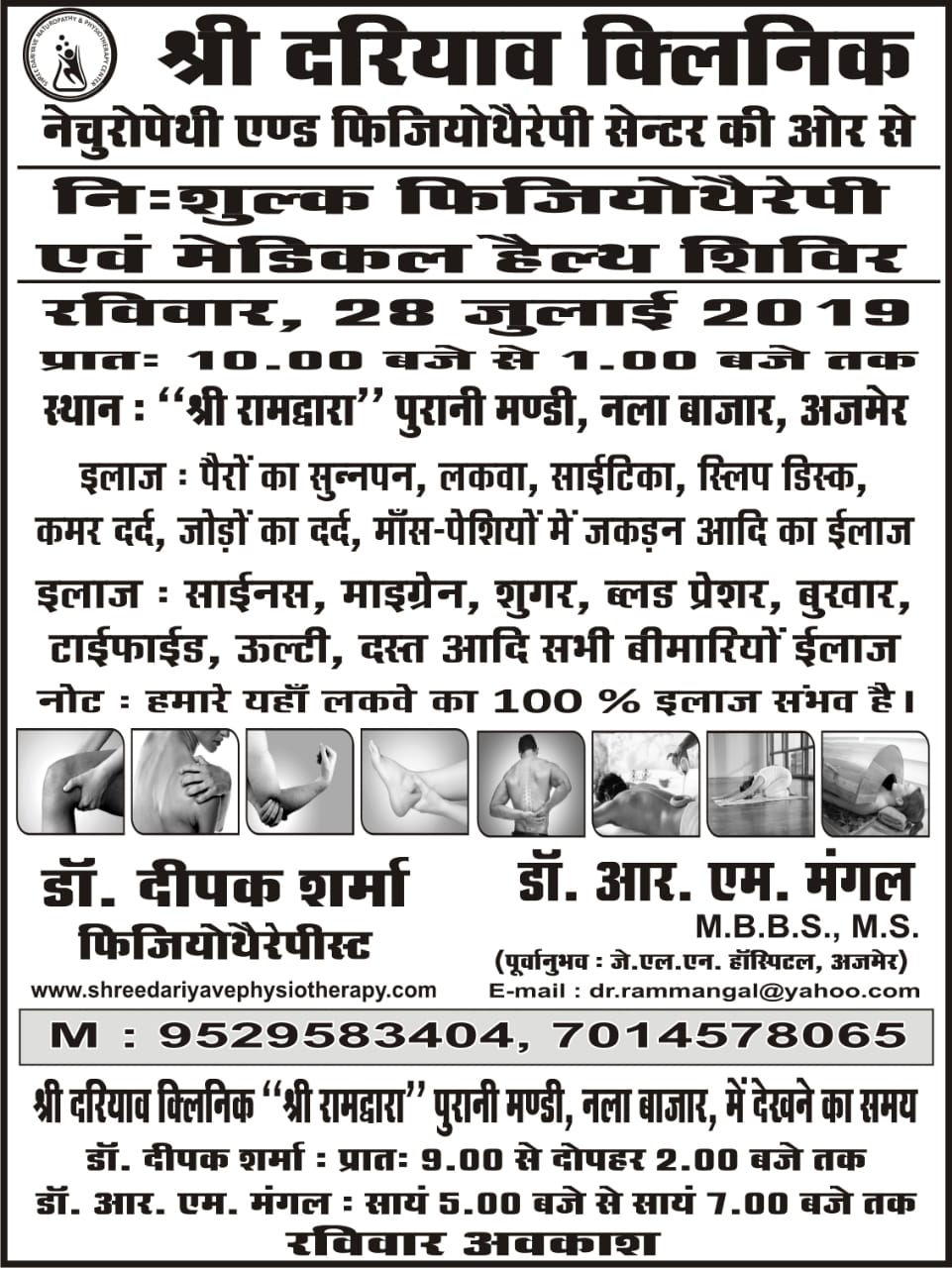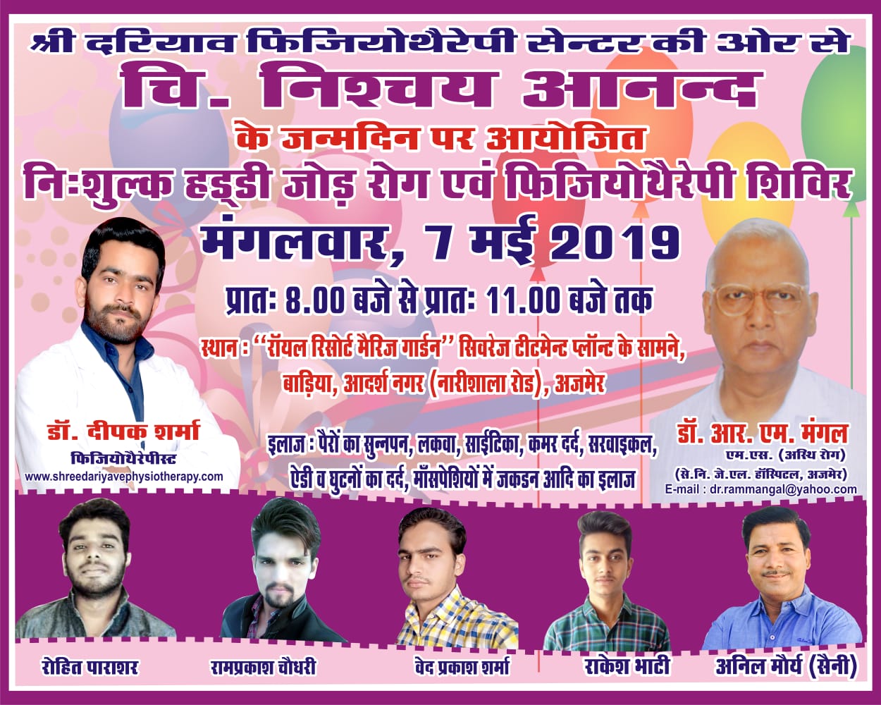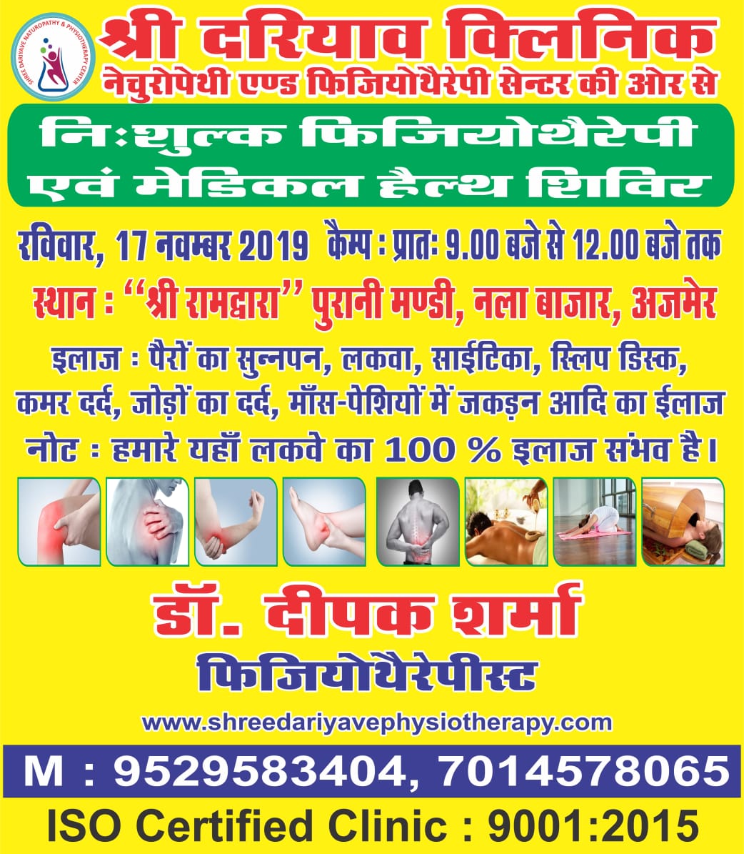 श्री दरीयाव फिजियोथेरेपी की और से चि. निश्चय आनंद के जन्म दिवस पर आयोजित निशुल्क हड्डी जोड़ रोग एवं फिजियोथेरेपी शिविर मंगलवार , 7 मई 2019 प्रात: 8:00 बजे से प्रात: 11 बजे तक स्थान : " रॉयल रिसोर्ट मैरिज गार्डन " सिवरेज प्लांट के सामने , बाडिया , आदर्श नगर (नारीशाला रोड), अजमेर